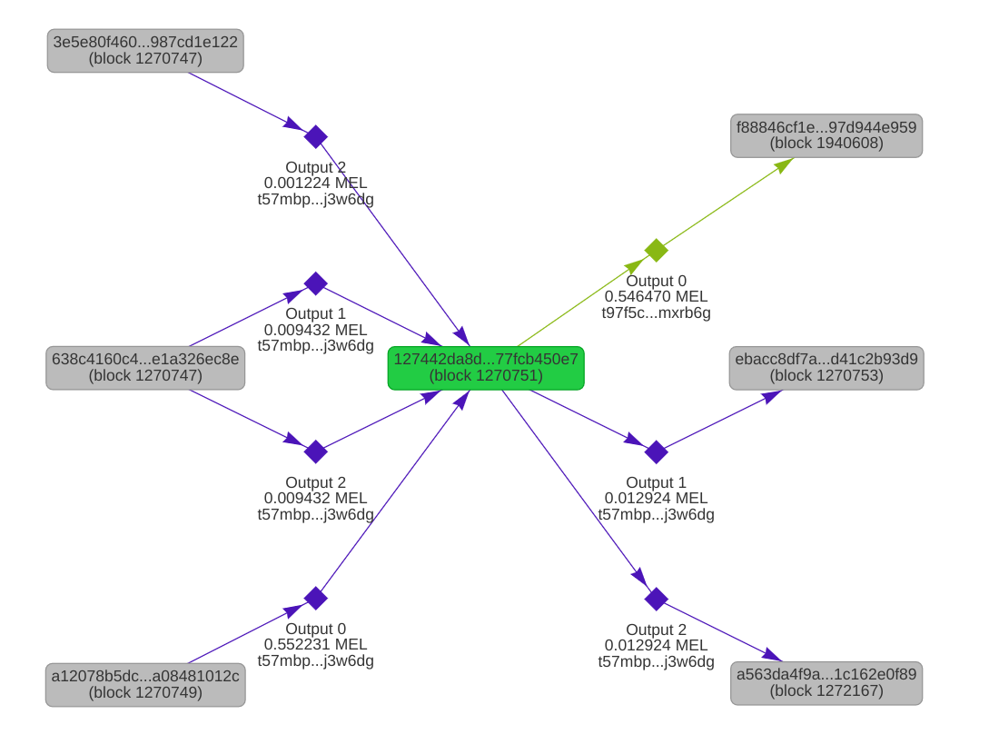 The outputs of this transaction are more interesting: they must sum to the same amount of 0.572319 MEL (including the fees), but one of the outputs β the first one with value 0.546470 MEL β is locked by a different covenant, with hash t97..b6g, and colored green in the graphical visualization above.