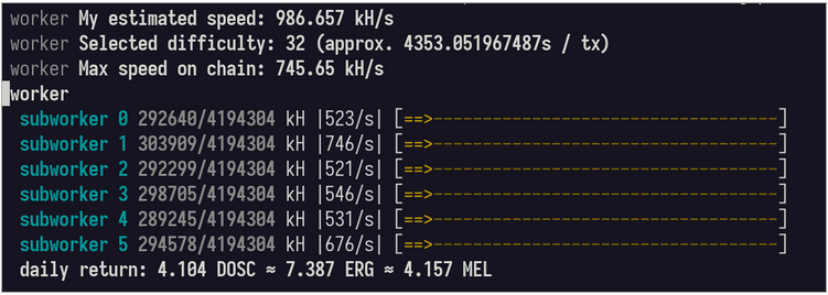 Running `melminter` will generate ERG, a temporary token representing computation, and immediately exchange it for MEL. Note the *daily return* line in the terminal output, which predicts how much computational work (in DOSC) the minter will do in 24 hours, as well as how much MEL that will buy.